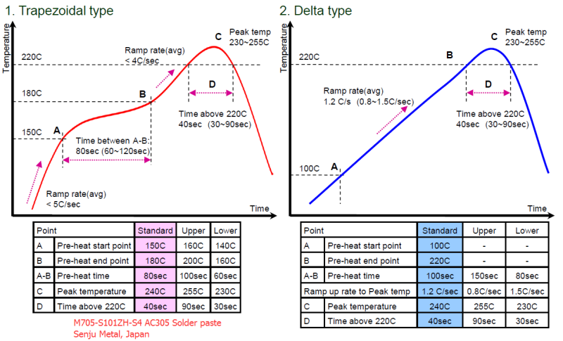 預(yù)熱區(qū):預(yù)熱通常是指將溫度從常溫升高到150℃和從150℃升高到180℃。從正常到150℃的溫度升高小于5℃/秒(在1.5℃?3℃ °C /秒),150℃至180℃之間的時間約為60?220秒。 緩慢加熱的好處是讓糊狀蒸氣中的溶劑和水按時出來。 它還可以讓大型組件與其他小型組件一起加熱。