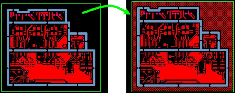 另一個(gè)例子是“銅平衡” - 許多PCB設(shè)計(jì)使用大面積銅區(qū),如果將PCB放入面板以輔助制造過(guò)程,則會(huì)導(dǎo)致銅不平衡。 這可能會(huì)導(dǎo)致面板在回流期間發(fā)生翹曲,因此推薦的解決方案是在面板的廢棄區(qū)域添加“銅平衡”,如下所示: -
