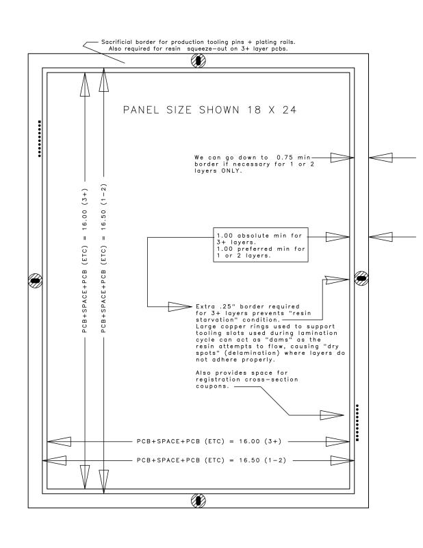這有助于了解大多數(shù)PCB制造商在其層壓過(guò)程中使用機(jī)加工金屬板。 這些印版非常昂貴,所以制造商通常只會(huì)儲(chǔ)存一到兩種標(biāo)準(zhǔn)尺寸。 在美國(guó),目前最常見(jiàn)的尺寸是18x24,其中一些也采用16x21或12x18的印版。 您需要了解,無(wú)論您的制造商將向您發(fā)送的任何尺寸的PCB或子面板都必須有效地使用此尺寸的材料。
