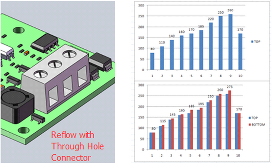 在大多數(shù)情況下,回流爐的熱設(shè)定點(diǎn)對(duì)于同一區(qū)域內(nèi)的頂部和底部加熱元件都是相同的。 但有些特殊情況需要對(duì)TOP和BOTTOM元件應(yīng)用不同的溫度設(shè)置。 SMT工藝工程師應(yīng)該檢查特定的電路板要求以確定正確的設(shè)置。 一般來(lái)說(shuō),以下是設(shè)定加熱元件溫度的一些指導(dǎo)原則: 如果電路板上有通孔(TH)元件,并且您想用SMT元件將它們一起回流,則可能需要考慮增加底部元件的溫度,因?yàn)門(mén)H元件會(huì)阻塞頂部的熱空氣循環(huán),從而阻止TH元件下方的焊盤(pán)接受足夠的熱量以形成良好的焊接接頭。 大多數(shù)TH連接器外殼由塑料制成,一旦溫度變得太高,塑料就會(huì)熔化。 過(guò)程工程師必須先執(zhí)行測(cè)試并檢查結(jié)果。