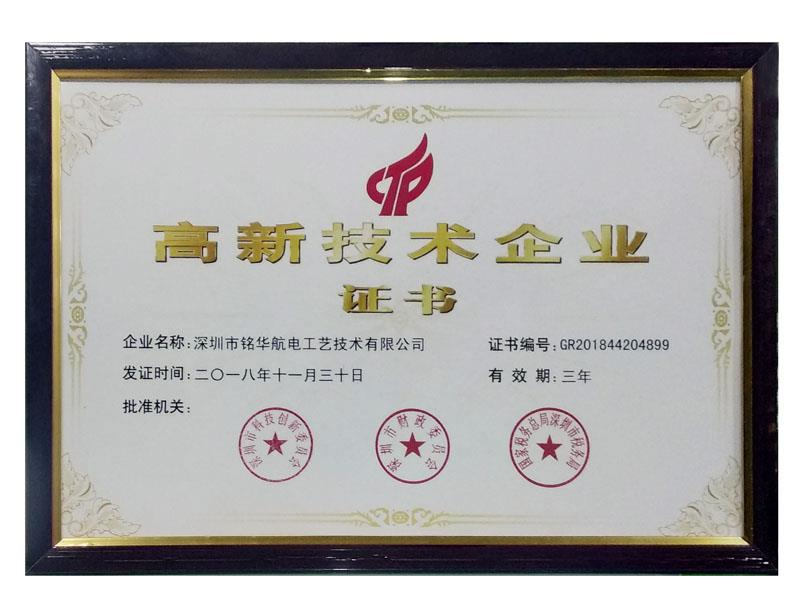 2018年11月30日,深圳市銘華航電工藝技術(shù)有限公司獲得了由深圳市科技創(chuàng)新委員會(huì)、深圳市財(cái)政委員會(huì)、國(guó)家國(guó)家稅務(wù)局深圳市稅務(wù)局聯(lián)合批準(zhǔn)下發(fā)的《高新技術(shù)企業(yè)證書》。