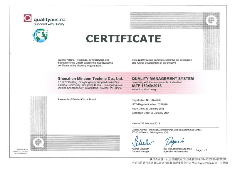 銘華航電取得電子線路板裝配 IATF16949:2016 質(zhì)量管理體系認證證書的公告